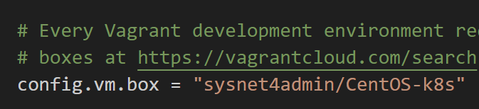 config.vm.box = "sysnet4admin/CentOS-k8s" 로 입력 하고