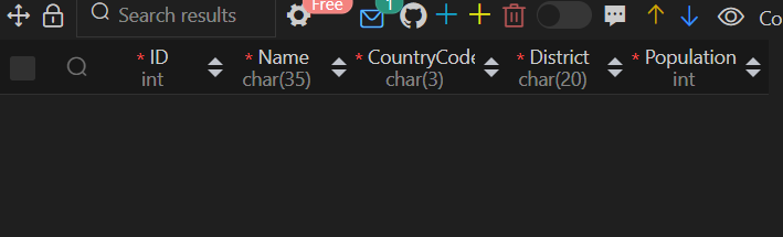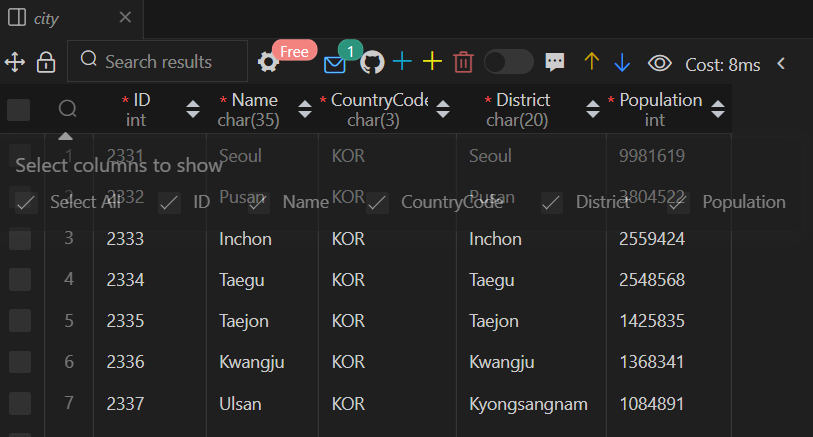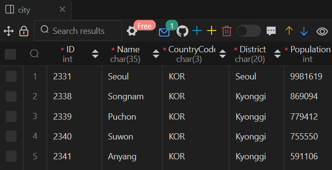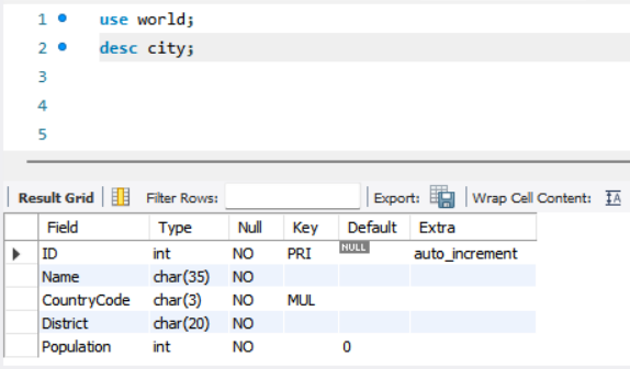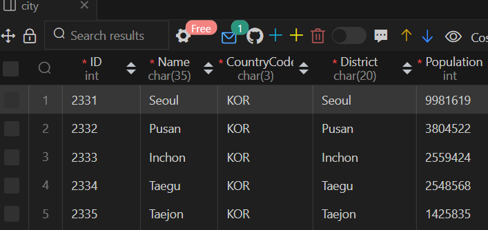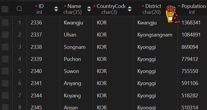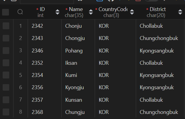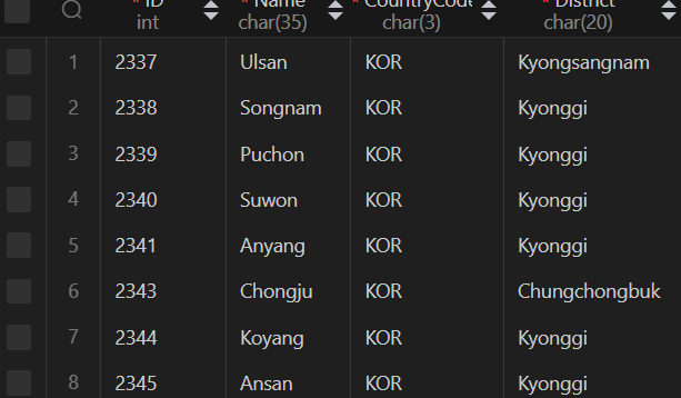 world 데이터베이스 city 테이블 정보보기