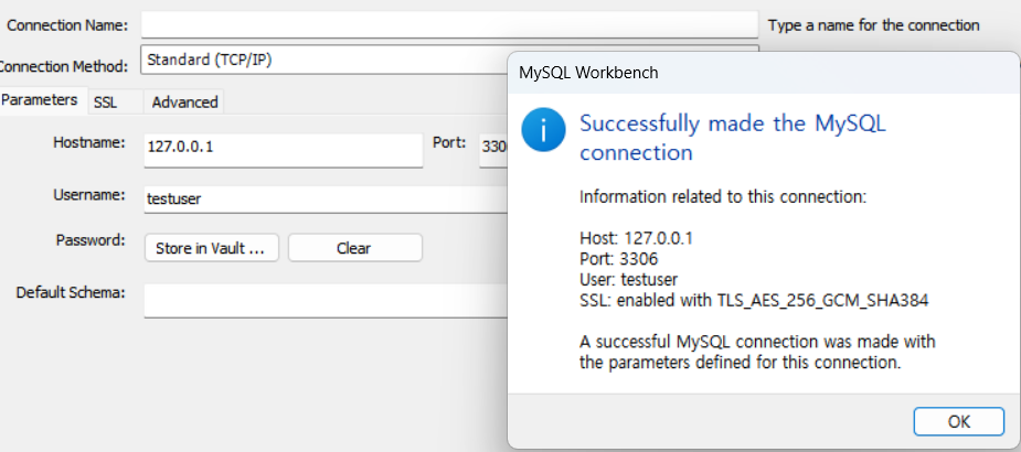 “testuser”에게 “mywork”database에대한 모든 권한 할당 (workbench)