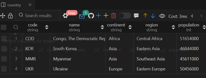 SELECT code, name, continent, region, population