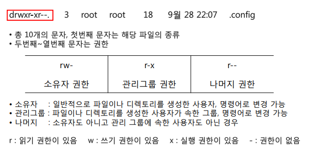 1\. 해당 파일의 종류 (Directory, Regular file, Symbolic link 등)2\. 소유자 권한3\. 그룹 권한4\. 모든 유저 권한r : read 읽기 권한w : write 쓰기 권한x : execute 실행 권한명령어: chmod이진법을 이용
