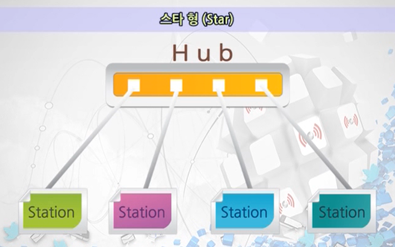 허브라는 네트워크 연결장치로 케이블을 통해 컴퓨터를 일대일로 연결.