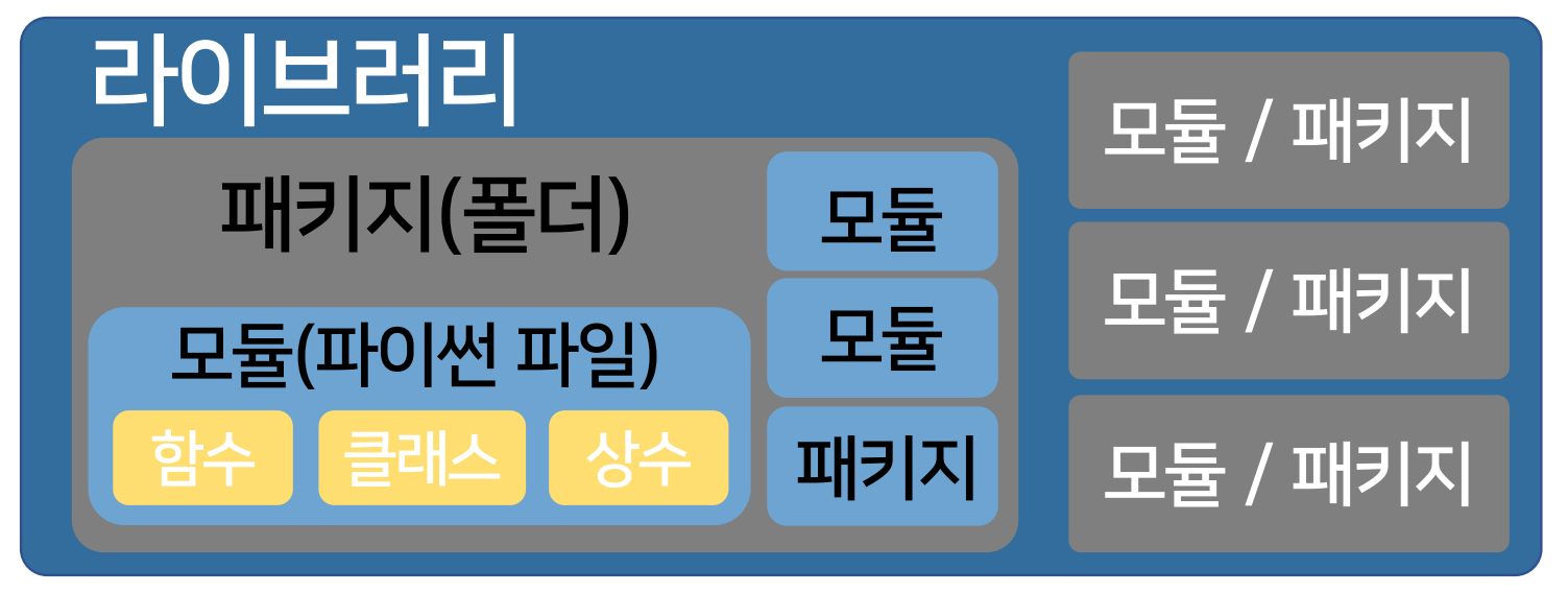 - 라이브러리 : 패키지 및 모듈의 집합 ( 새로운 분야에 맞는 패키지 및 모듈의 집합)