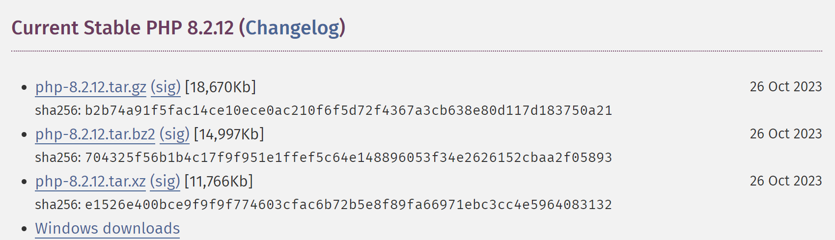 Current Stable PHP 8.2.12 (Changelog) php-8.2.12.tar.gz (sig) [18,670Kb] 26 Oct 2023 b2b74a91f5fac14ce10ece0ac210f6f5d72f4367a3cb638e80d117d183750a21 php-8.2.12.tar.bz2 (sig) [14,997Kb] 26 Oct 2023 704325f56b1b4c17f9f951e1ffef5c64e148896053f34e2626152cbaa2