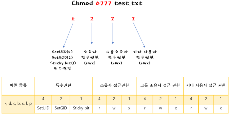 - 권한 : r(읽기), w(쓰기), x(실행)