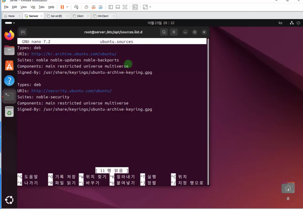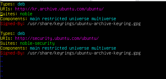 /etc/apt/sources.list.d/ubuntu.sources 파일 3행 noble만 남기고 삭제 후 저장