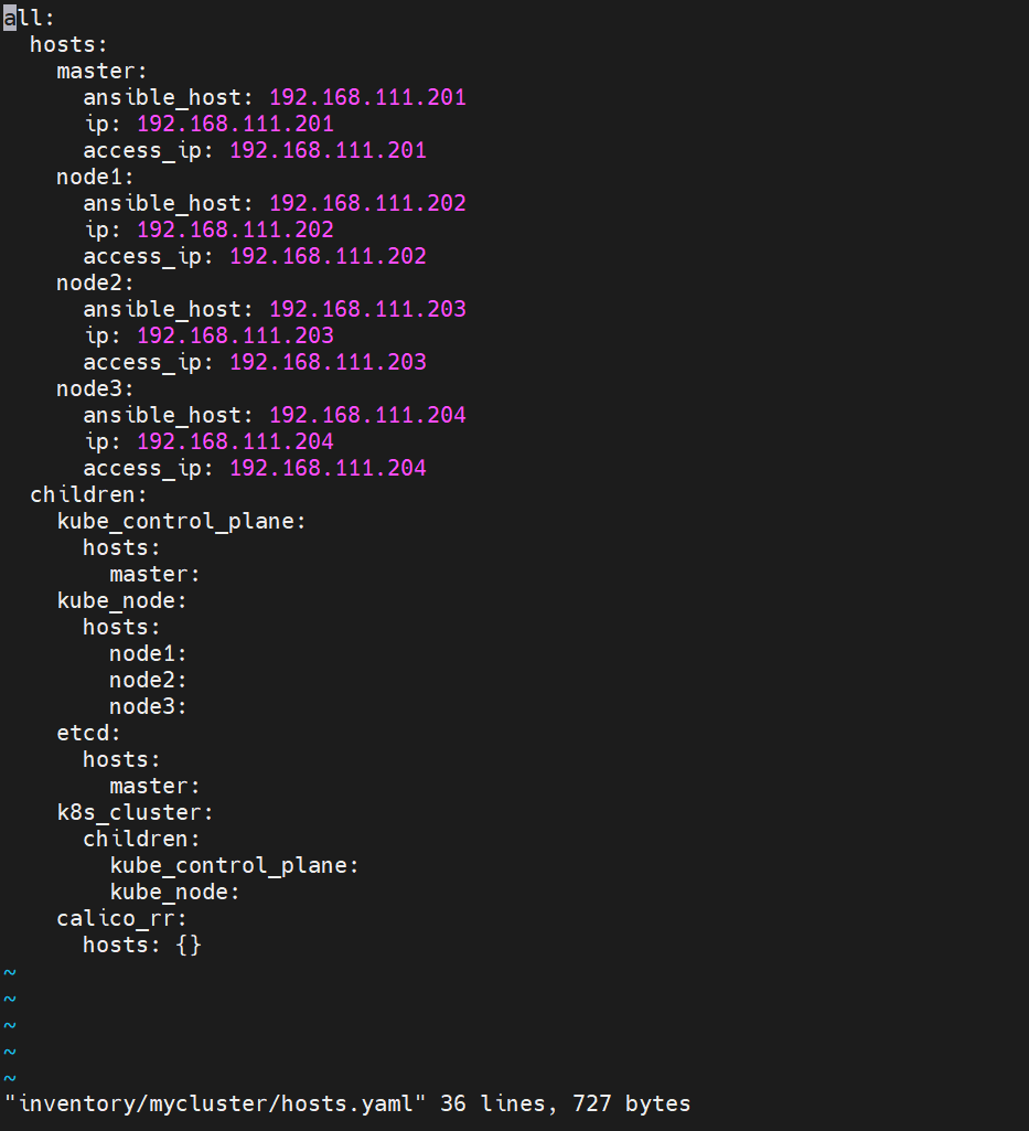 $ CONFIG_FILE=inventory/mycluster/hosts.yaml python3 contrib/inventory_builder/inventory.py ${IPS[@]}