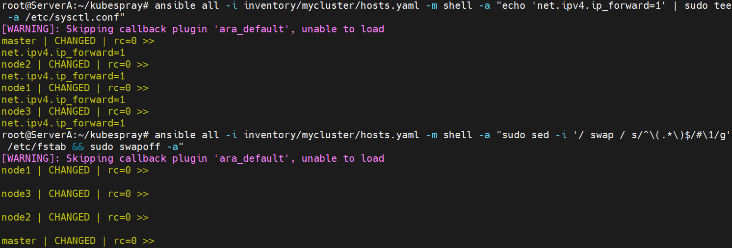 ansible all -i inventory/mycluster/hosts.yaml -m shell -a "echo 'net.ipv4.ip_forward=1' | sudo tee -a /etc/sysctl.conf"
