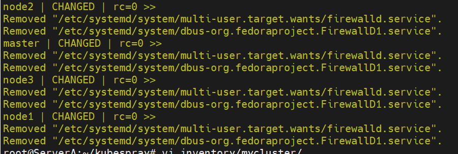 ansible all -i inventory/mycluster/hosts.yaml -m shell -a "sudo systemctl stop firewalld && sudo systemctl disable firewalld"