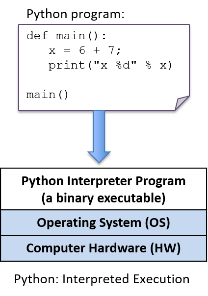Python is an interpreted programming language, which means that another program, the Python interpreter, runs Python programs: the Python interpreter acts like a virtual machine on which Python programs are run. To run a Python program, the program source