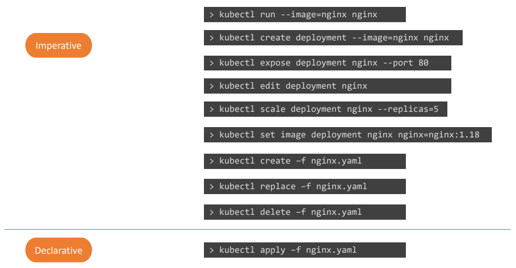 - 예: kubectl run, kubectl create, kubectl expose 등의 명령어 사용.