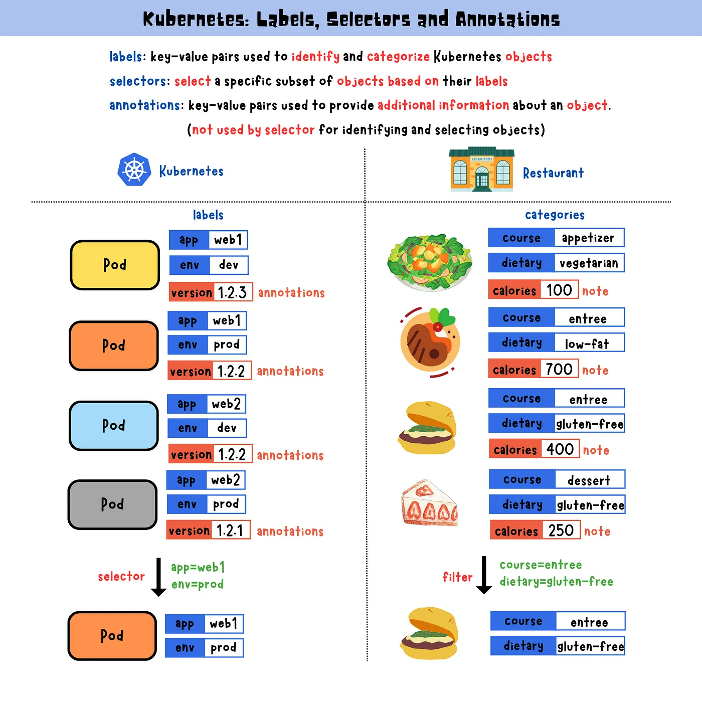 - 예: app=frontend로 모든 프론트엔드 Pod 선택.