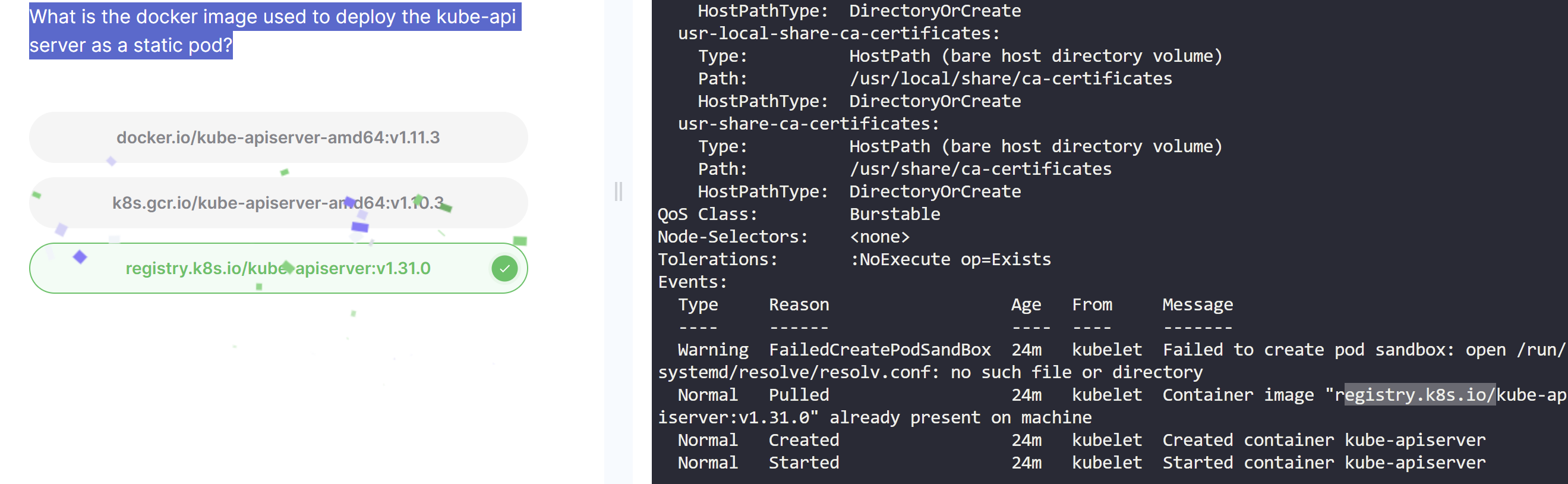 - kubectl describe pod kube-apiserver-controlplane -n kube-system