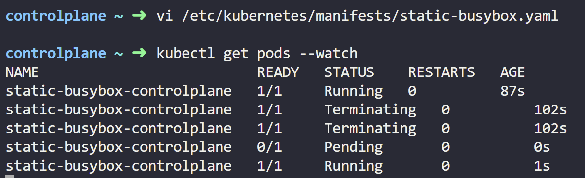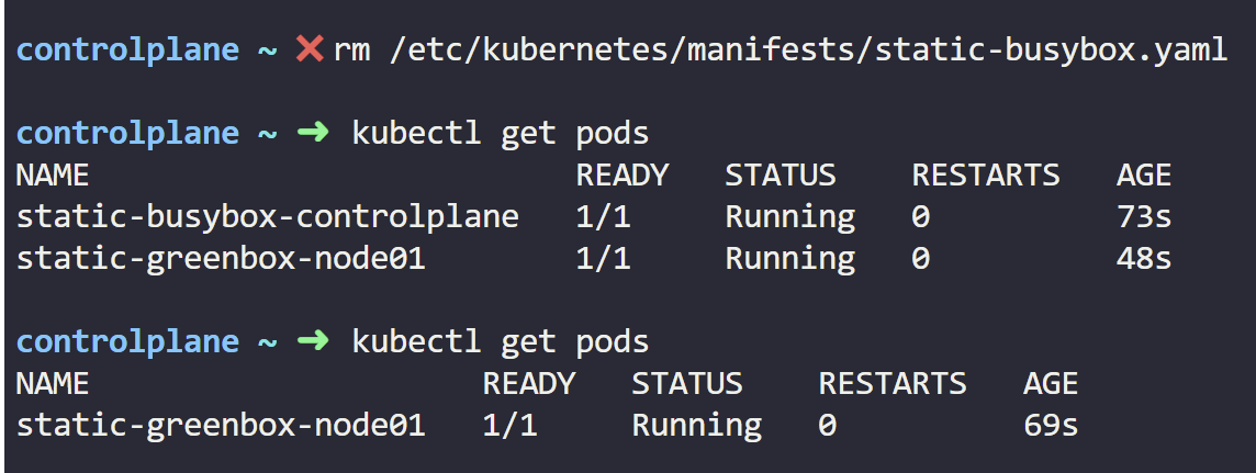 - rm /etc/kubernetes/manifests/static-busybox.yaml