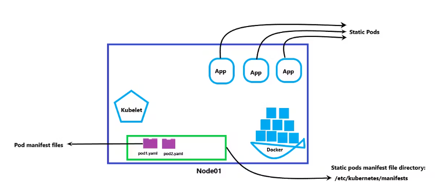- kubelet은 설정된 디렉토리(예: /etc/kubernetes/manifests)를 주기적으로 확인하여 정의 파일을 읽고 Static Pod를 생성합니다.