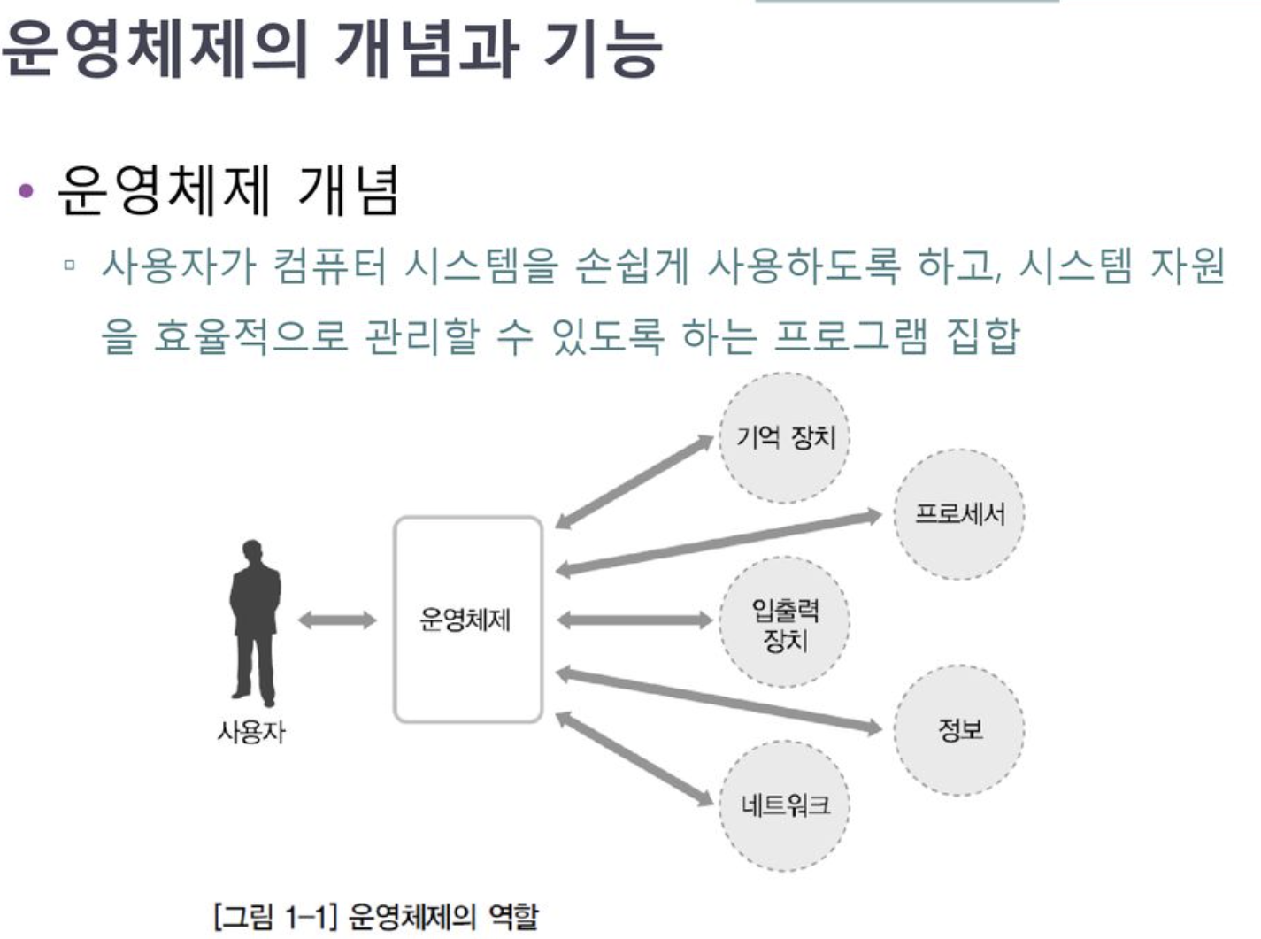 컴퓨터 시스템 자원(기억장치, 프로세서, 입출력장치 등)을 효율적으로 관리하고 사용자가 시스템을 쉽게 사용할 수 있도록 돕는 프로그램 집합. - 운영체제의 주요 기능