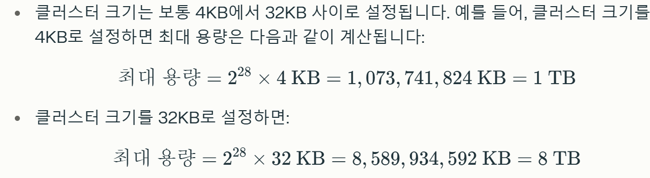 - 따라서 FAT32는 최대 228개의 클러스터를 관리할 수 있습니다.