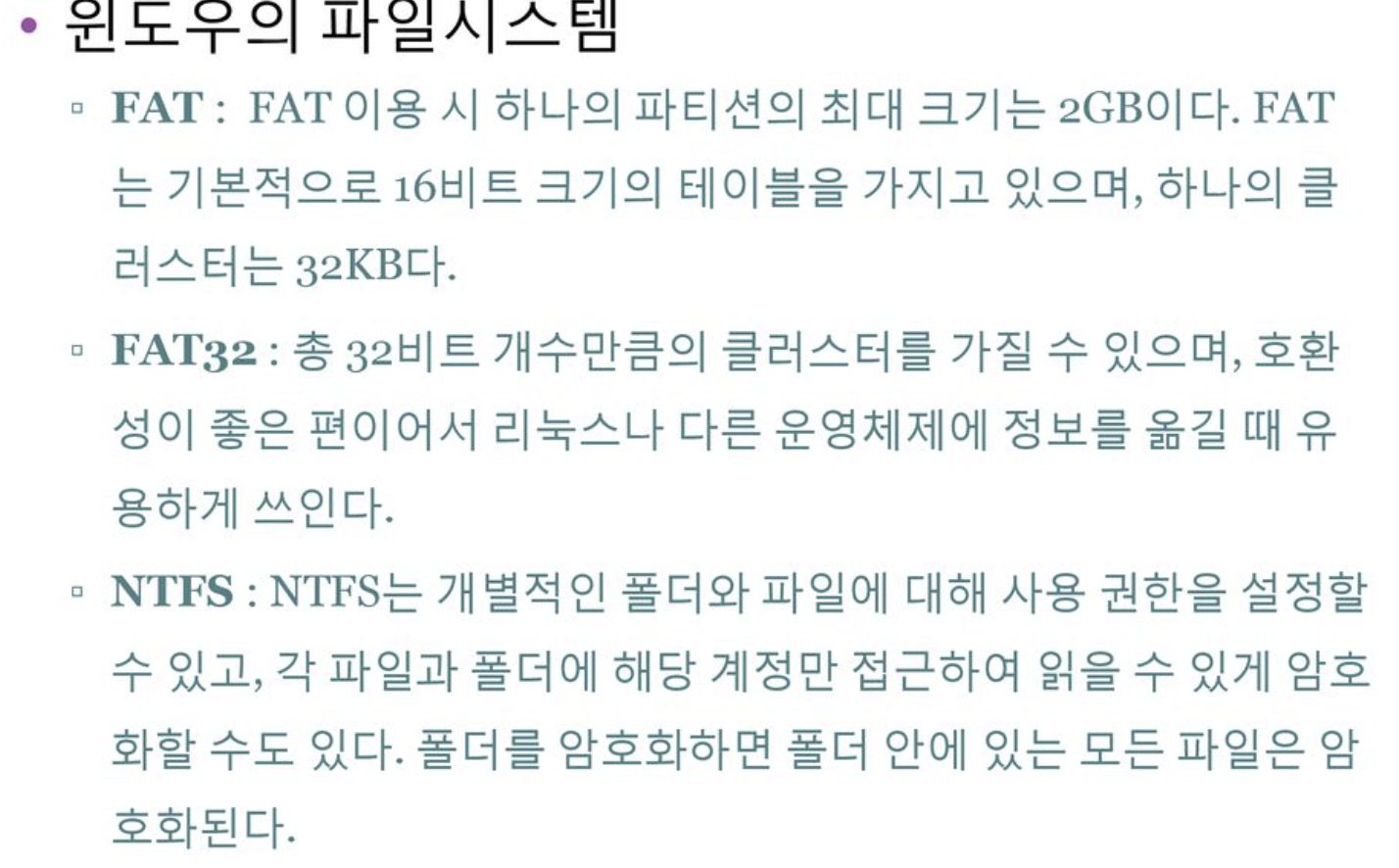 - NTFS: 파일/폴더별 권한 설정 및 암호화 지원.