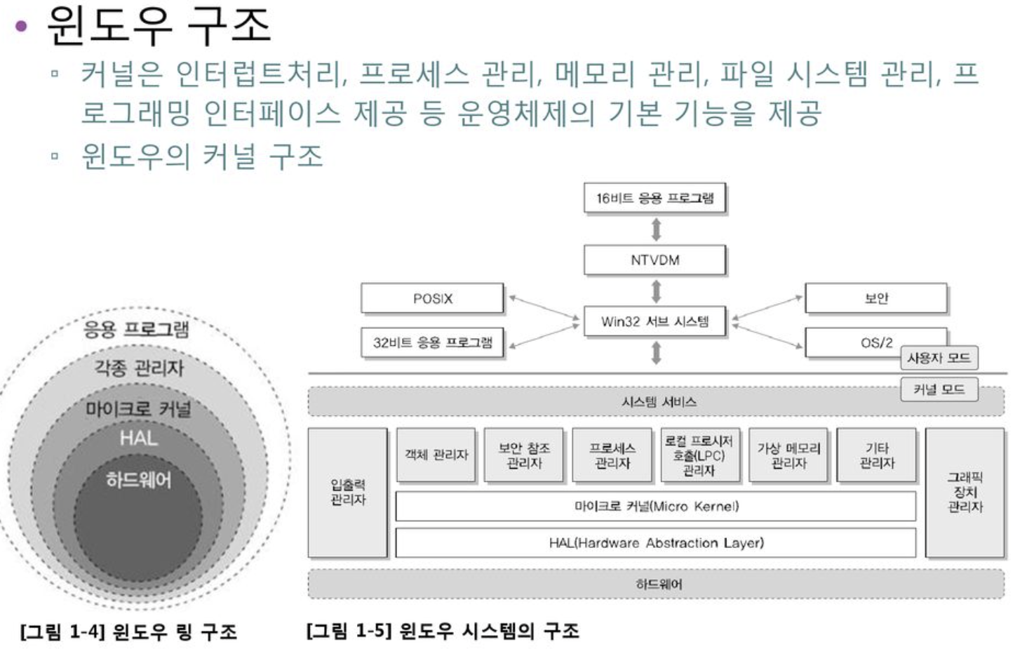 - 링 구조: 하드웨어 → HAL → 마이크로 커널 → 관리자들 → 응용 프로그램.
