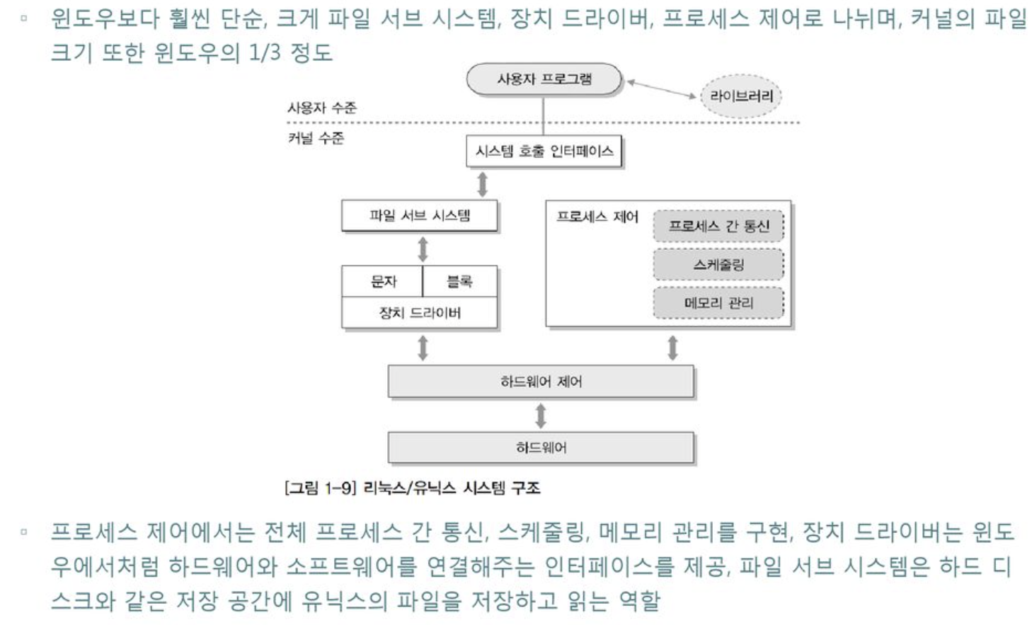 윈도우는 본래 커널이 하던 일을 여러 관리자가 분담한 반면, 유닉스 커널은 윈도우처럼 개별 관리자가 존재하지 않는다.