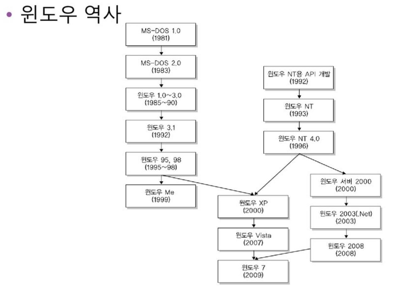 - 1993년 DOS에서 시작한 PC용 운영체제인 윈도우를 서버용 운영체제의 개념인 NT 버전으로 출시