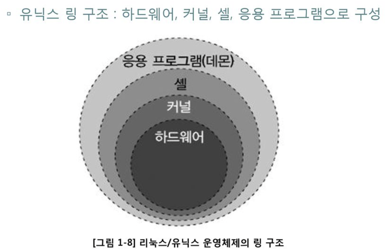 - 구성 요소: 하드웨어 → 커널 → 셸(Shell) → 응용 프로그램.