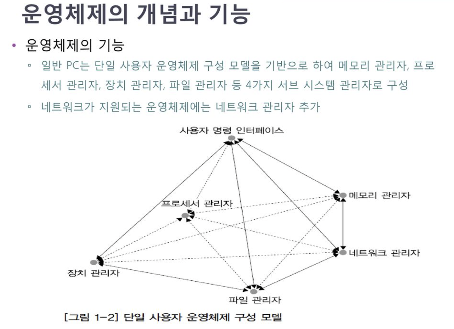 - 단일 사용자 PC: 메모리 관리자, 프로세서 관리자, 장치 관리자, 파일 관리자.